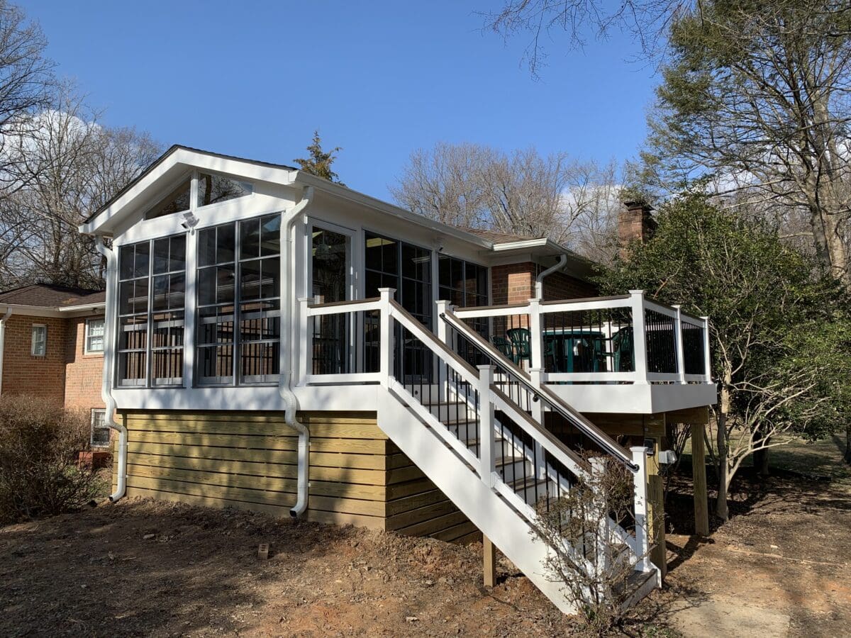 We used Sunspace windows to give the room an open, breezy feel while keeping the elements in check. On the exterior, Trex Transcend decking in Spiced Rum brings warmth and durability underfoot, paired with clean white vinyl railings and sleek black balusters for contrast.